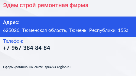 Эдем строй, ремонтная фирма по адресу 625026, Тюменская область, Тюмень, Республики, 155а в дальнейшем Организация, размещена в следующих категориях: