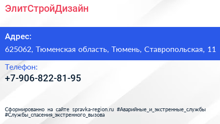 ЭлитСтройДизайн по адресу 625062, Тюменская область, Тюмень, Ставропольская, 11 в дальнейшем Организация, размещена в следующих категориях: