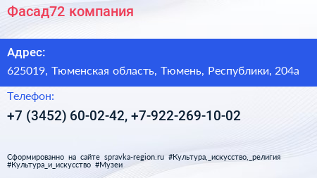 Фасад72, компания по адресу 625019, Тюменская область, Тюмень, Республики, 204а в дальнейшем Организация, размещена в следующих категориях: