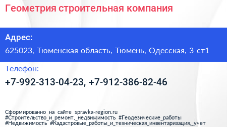 Геометрия, строительная компания по адресу 625023, Тюменская область, Тюмень, Одесская, 3 ст1 в дальнейшем Организация, размещена в следующих категориях: