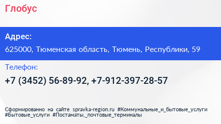 Глобус по адресу 625000, Тюменская область, Тюмень, Республики, 59 в дальнейшем Организация, размещена в следующих категориях: