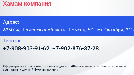 Хамам, компания по адресу 625014, Тюменская область, Тюмень, 50 лет Октября, 213 в дальнейшем Организация, размещена в следующих категориях: