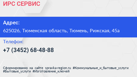ИРС СЕРВИС по адресу 625026, Тюменская область, Тюмень, Рижская, 45а в дальнейшем Организация, размещена в следующих категориях: