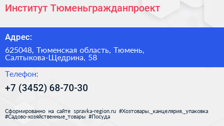 Институт Тюменьгражданпроект по адресу 625048, Тюменская область, Тюмень, Салтыкова-Щедрина, 58 в дальнейшем Организация, размещена в следующих категориях: