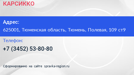 КАРСИККО по адресу 625001, Тюменская область, Тюмень, Полевая, 109 ст9 в дальнейшем Организация, размещена в следующих категориях: