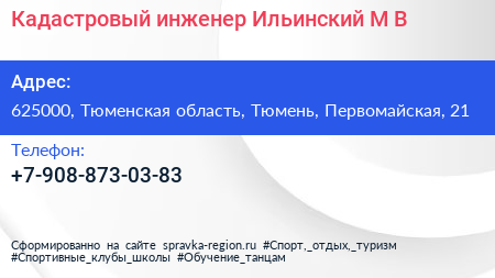 Кадастровый инженер Ильинский М.В. по адресу 625000, Тюменская область, Тюмень, Первомайская, 21 в дальнейшем Организация, размещена в следующих категориях: