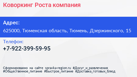Коворкинг Роста, компания по адресу 625000, Тюменская область, Тюмень, Дзержинского, 15 в дальнейшем Организация, размещена в следующих категориях: