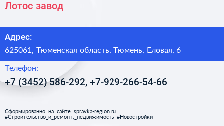 Лотос, завод по адресу 625061, Тюменская область, Тюмень, Еловая, 6 в дальнейшем Организация, размещена в следующих категориях: