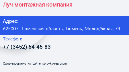 Луч, монтажная компания по адресу 625007, Тюменская область, Тюмень, Молодёжная, 74 в дальнейшем Организация, размещена в следующих категориях: