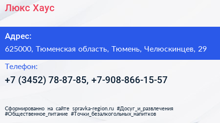 Люкс Хаус по адресу 625000, Тюменская область, Тюмень, Челюскинцев, 29 в дальнейшем Организация, размещена в следующих категориях: