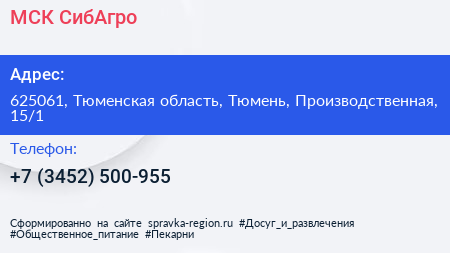 МСК СибАгро по адресу 625061, Тюменская область, Тюмень, Производственная, 15/1 в дальнейшем Организация, размещена в следующих категориях: