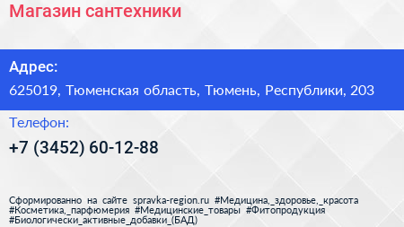 Магазин сантехники по адресу 625019, Тюменская область, Тюмень, Республики, 203 в дальнейшем Организация, размещена в следующих категориях: