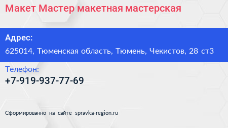 Макет-Мастер, макетная мастерская по адресу 625014, Тюменская область, Тюмень, Чекистов, 28 ст3 в дальнейшем Организация, размещена в следующих категориях: