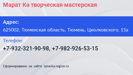 Марат Ка, творческая мастерская по адресу 625002, Тюменская область, Тюмень, Циолковского, 15а в дальнейшем Организация, размещена в следующих категориях:
