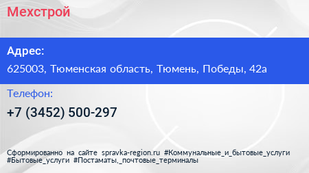 Мехстрой по адресу 625003, Тюменская область, Тюмень, Победы, 42а в дальнейшем Организация, размещена в следующих категориях: