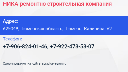 НИКА, ремонтно-строительная компания по адресу 625049, Тюменская область, Тюмень, Калинина, 62 в дальнейшем Организация, размещена в следующих категориях: