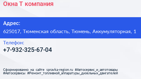 Окна Т, компания по адресу 625017, Тюменская область, Тюмень, Аккумуляторная, 1 в дальнейшем Организация, размещена в следующих категориях: