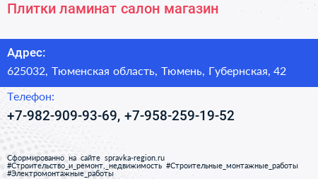 Плитки & ламинат, салон-магазин по адресу 625032, Тюменская область, Тюмень, Губернская, 42 в дальнейшем Организация, размещена в следующих категориях:
