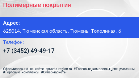 Полимерные покрытия по адресу 625014, Тюменская область, Тюмень, Тополиная, 6 в дальнейшем Организация, размещена в следующих категориях: