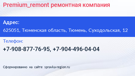 Premium_remont, ремонтная компания по адресу 625051, Тюменская область, Тюмень, Суходольская, 12 в дальнейшем Организация, размещена в следующих категориях: