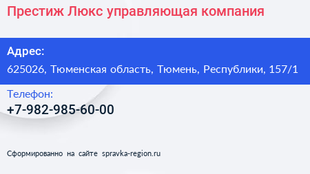 Престиж-Люкс, управляющая компания по адресу 625026, Тюменская область, Тюмень, Республики, 157/1 в дальнейшем Организация, размещена в следующих категориях: