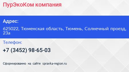 ПурЭкоКом, компания по адресу 625022, Тюменская область, Тюмень, Солнечный проезд, 23а в дальнейшем Организация, размещена в следующих категориях: