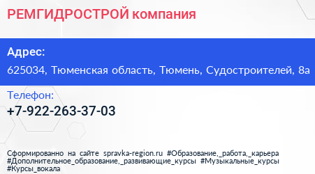 РЕМГИДРОСТРОЙ, компания по адресу 625034, Тюменская область, Тюмень, Судостроителей, 8а в дальнейшем Организация, размещена в следующих категориях:
