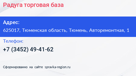 Радуга, торговая база по адресу 625017, Тюменская область, Тюмень, Авторемонтная, 1 в дальнейшем Организация, размещена в следующих категориях: