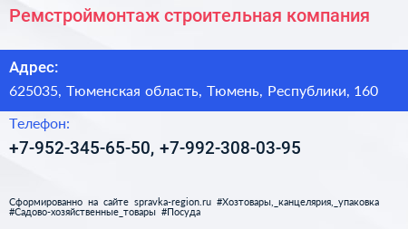 Ремстроймонтаж, строительная компания по адресу 625035, Тюменская область, Тюмень, Республики, 160 в дальнейшем Организация, размещена в следующих категориях: