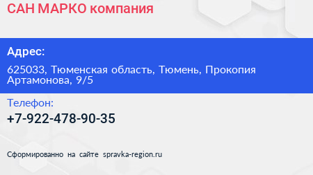 САН МАРКО, компания по адресу 625033, Тюменская область, Тюмень, Прокопия Артамонова, 9/5 в дальнейшем Организация, размещена в следующих категориях: