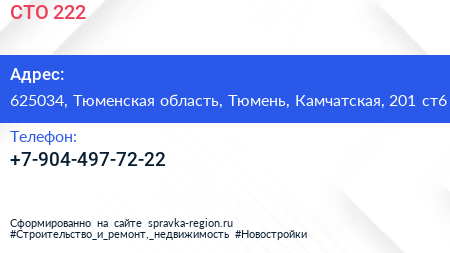 СТО 222 по адресу 625034, Тюменская область, Тюмень, Камчатская, 201 ст6 в дальнейшем Организация, размещена в следующих категориях: