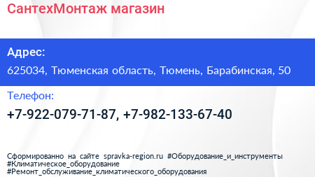 СантехМонтаж, магазин по адресу 625034, Тюменская область, Тюмень, Барабинская, 50 в дальнейшем Организация, размещена в следующих категориях: