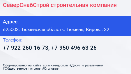 СеверСнабСтрой, строительная компания по адресу 625003, Тюменская область, Тюмень, Кирова, 32 в дальнейшем Организация, размещена в следующих категориях: