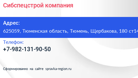 Сибспецстрой, компания по адресу 625059, Тюменская область, Тюмень, Щербакова, 180 ст14 в дальнейшем Организация, размещена в следующих категориях: