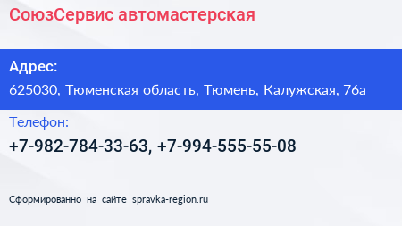 СоюзСервис, автомастерская по адресу 625030, Тюменская область, Тюмень, Калужская, 76а в дальнейшем Организация, размещена в следующих категориях: