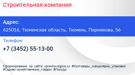 Строительная компания по адресу 625016, Тюменская область, Тюмень, Пермякова, 56 в дальнейшем Организация, размещена в следующих категориях: