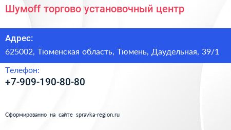 Шумoff, торгово-установочный центр по адресу 625002, Тюменская область, Тюмень, Даудельная, 39/1 в дальнейшем Организация, размещена в следующих категориях:
