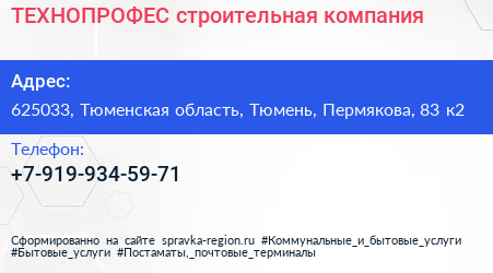 ТЕХНОПРОФЕС, строительная компания по адресу 625033, Тюменская область, Тюмень, Пермякова, 83 к2 в дальнейшем Организация, размещена в следующих категориях: