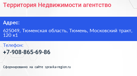 Территория Недвижимости, агентство по адресу 625049, Тюменская область, Тюмень, Московский тракт, 120 к1 в дальнейшем Организация, размещена в следующих категориях: