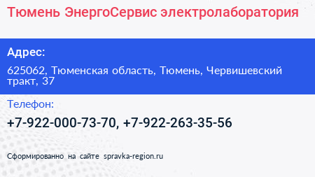 Тюмень ЭнергоСервис, электролаборатория по адресу 625062, Тюменская область, Тюмень, Червишевский тракт, 37 в дальнейшем Организация, размещена в следующих категориях: