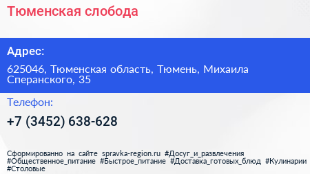 Тюменская слобода по адресу 625046, Тюменская область, Тюмень, Михаила Сперанского, 35 в дальнейшем Организация, размещена в следующих категориях: