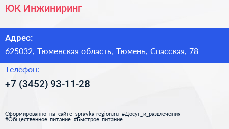 ЮК-Инжиниринг по адресу 625032, Тюменская область, Тюмень, Спасская, 78 в дальнейшем Организация, размещена в следующих категориях: