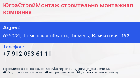 ЮграСтройМонтаж, строительно-монтажная компания по адресу 625034, Тюменская область, Тюмень, Камчатская, 192 в дальнейшем Организация, размещена в следующих категориях: