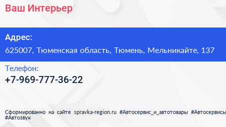 Ваш Интерьер по адресу 625007, Тюменская область, Тюмень, Мельникайте, 137 в дальнейшем Организация, размещена в следующих категориях: