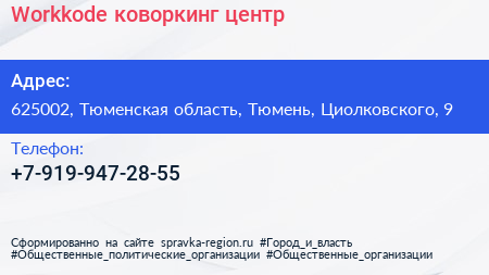 Workkode, коворкинг-центр по адресу 625002, Тюменская область, Тюмень, Циолковского, 9 в дальнейшем Организация, размещена в следующих категориях: