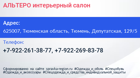 АЛЬТЕРО, интерьерный салон по адресу 625007, Тюменская область, Тюмень, Депутатская, 129/5 в дальнейшем Организация, размещена в следующих категориях: