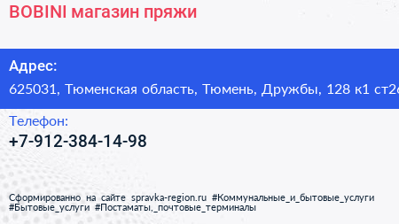 BOBINI, магазин пряжи по адресу 625031, Тюменская область, Тюмень, Дружбы, 128 к1 ст26 в дальнейшем Организация, размещена в следующих категориях: