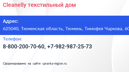 Cleanelly, текстильный дом по адресу 625040, Тюменская область, Тюмень, Тимофея Чаркова, 60 в дальнейшем Организация, размещена в следующих категориях:
