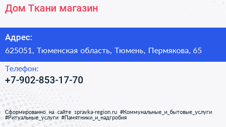 Дом Ткани, магазин по адресу 625051, Тюменская область, Тюмень, Пермякова, 65 в дальнейшем Организация, размещена в следующих категориях: