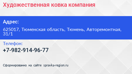 Художественная ковка, компания по адресу 625017, Тюменская область, Тюмень, Авторемонтная, 31/1 в дальнейшем Организация, размещена в следующих категориях: